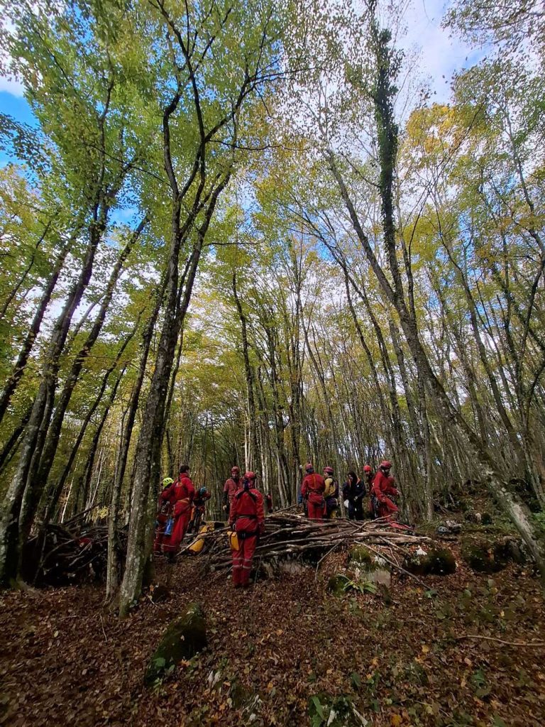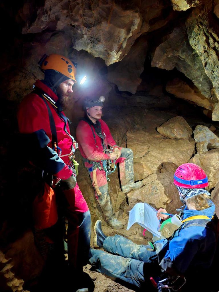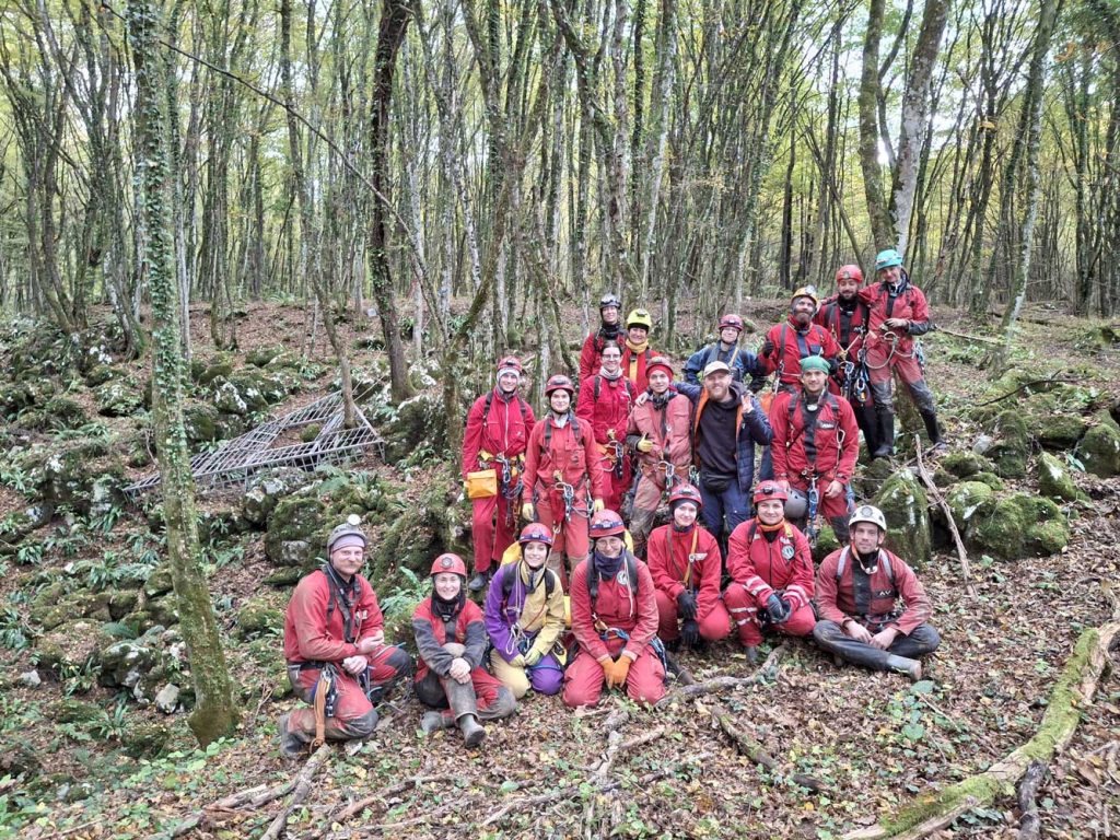 Kao i prošli vikend, pridružilo nam se nekoliko gostiju entuzijasta, pa je uskoro šuma oko Provale izgledala kao da ju je osvojilo čitavo pleme nekakvih zveckavih crvenih patuljaka. Još jedan srk kave na brzinu i seoba na ulaz jamu… na kojem su neki čekali red – pa, još koji sat. Kad su se napokon svi okupili u podzemlju, prvi je zadatak bio postavljanje bivka, a onda se ekipa razmilila po špilji i pod budnim okom instruktora počela (učiti) crtati. Dok se god nitko neće orijentirati po našim nacrtima, tvrdit ćemo da nam je išlo odlično.